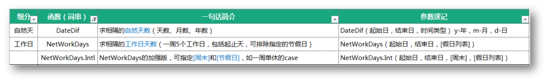 算天数:算年龄、算工龄、算倒计时、算工作天数、甚至各种花式放假请款下的天数:DatedDif(起始日,结束日,时间类型)