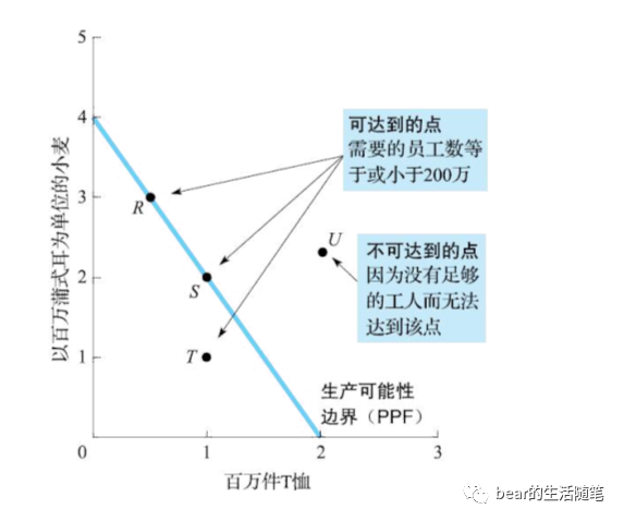 生产可能性边界帮助我们回答在第一章讨论的问题:问题中涉及的主体的欲望和约束是什么?美国人的欲望是消费T恤和小麦(在简化的模型里面欲望就只有这两个,实际当然是很多很多)。生产可能性边界让我们得以表示生产面临的约束:美国不能生产出边界线之外的T恤和小麦的组合(图中的U点),无论工人和时间在T恤和小麦之间如何分配,都没有足够的工人或时间去生产U点的产出组合。