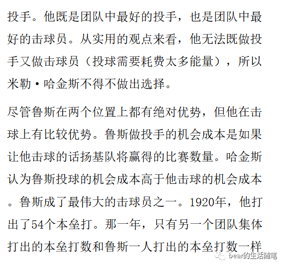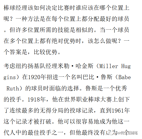 一个好的管理者应该像米勒.哈金斯(前美国职棒大联盟的选手、总教练)一样,根据球员的比较优势去分配球员的位置。问题不是在一个特定的位置上哪个球员最好,而是该队更能承受起在任何其他位置上失去该球员。当作为一个球员在球场上寻找一个特定的位置时,正确的建议也许不是他在这个位置是最好的,而是他在其他任何位置上的价值都更小!