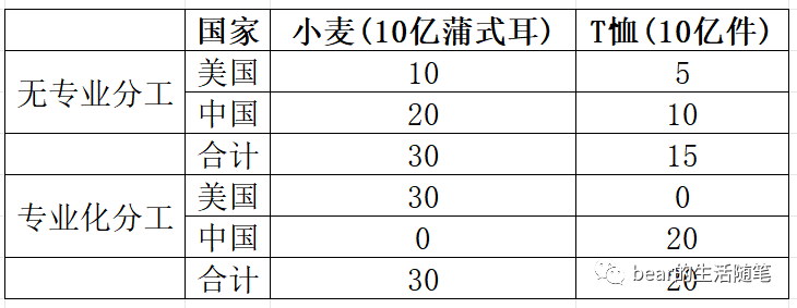 无专业化分工)。如果中国把所有的资源都用于制作T恤,美国把所有的资源都用于种植小麦,会发生什么?在下表(专业化分工)中给出了相应的结果: