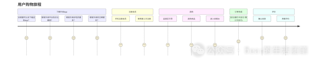 根据实际场景,我们可以先将用户行为概括为几个阶段,再把每个阶段里的行为分解为节点,用简短的中性动词来表述,按时间轴排序。在用户体验过程中,我们只需要取其中关键性动作,以定外卖为例,用户在点外卖的每个阶段都有明确的目标和需求,那么我们定性研究的时候,就应该完成提炼,而不是设计或直接自嗨式的臆想。