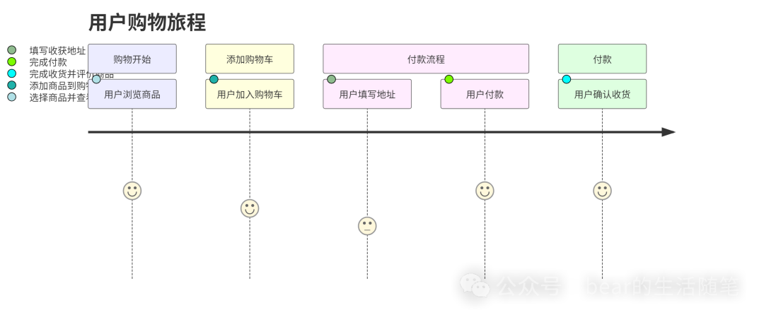 用户旅程图帮助我们理解用户与产品或服务的活动过程。在购物网站的例子中,我们可以用它来展示用户浏览商品到完成购买的过程。