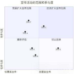 quadrantChart    title 宣传活动的范围和参与度    x-axis "低覆盖宣传" --> "高覆盖宣传"    y-axis "低参与度" --> "高参与度"    quadrant-1 "应该扩大宣传范围"    quadrant-2 "需要扩大宣传范围"    quadrant-3 "重新评估"    quadrant-4 "可以改进"    "活动 A": [0.30.6]    "活动 B": [0.450.23]    "活动 C": [0.570.69]    "活动 D": [0.780.34]    "活动 E": [0.400.34]    "活动 F": [0.350.78]