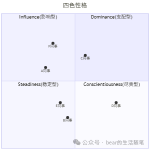 用一个四色性格理论来制作一个象限图,这四种类型分别代表了不同的行为特征、沟通方式和应对压力的策略。