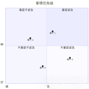 quadrantChart    title 事情优先级  x-axis "缓" --> "急"    y-axis "轻" --> "重"  quadrant-1 "重要紧急"  quadrant-2 "重要不紧急"  quadrant-3 "不重要不紧急"  quadrant-4 "不重要紧急"  "事件 A": [0.30.6]  "事件 B": [0.450.23]  "事件 C": [0.570.69]  "事件 D": [0.780.34]