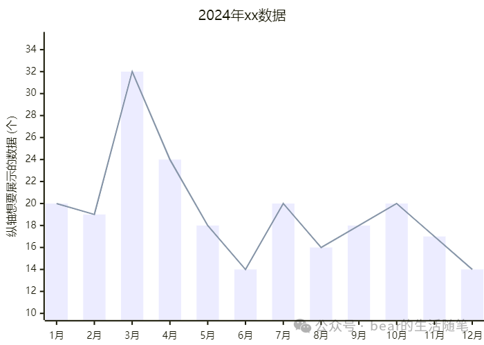 xychart-beta    title "2024年xx数据"    x-axis ["1月""2月""3月""4月""5月""6月""7月""8月","9月""10月""11月""12月"]    y-axis "纵轴想要展示的数据 (个)" 10 --> 35    bar [20, 19, 32, 24, 18, 14, 20, 16, 18, 20, 17, 14]    line [20, 19, 32, 24, 18, 14, 20, 16, 18, 20, 17, 14]