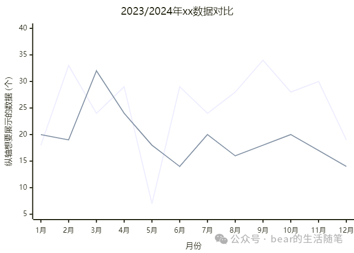 ---config:    xyChart:        width: 900        height: 600        titlePadding: 10        titleFontSize: 30        showTitle: true        chartOrientation: 'vertical'            themeVariables:         xyChart:            titleColor: "#ff0000"---xychart-beta    title "2023/2024年xx数据对比"    x-axis "月份" ["1月", "2月", "3月", "4月", "5月", "6月", "7月", "8月","9月", "10月", "11月", "12月"]    y-axis "纵轴想要展示的数据 (个)" 5 --> 40    line [18332429729242834283019]    line [201932241814201618201714]