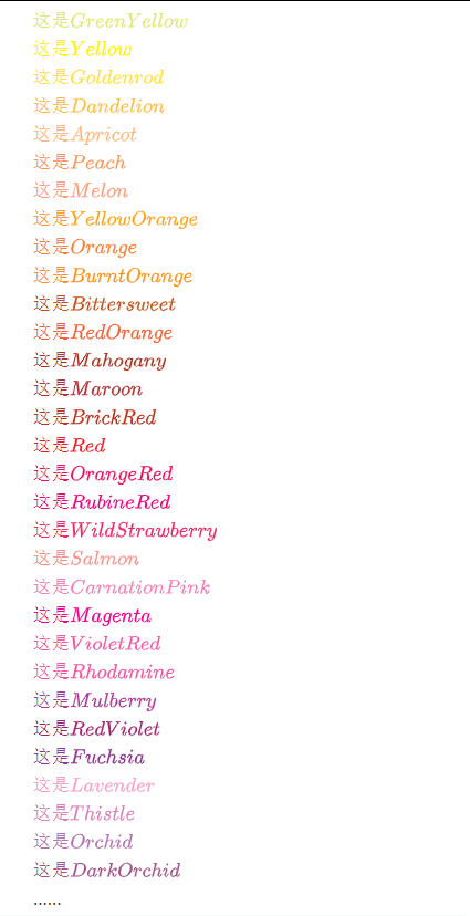 $textcolor{GreenYellow}{这是GreenYellow}$ $textcolor{Yellow}{这是Yellow}$ $textcolor{Goldenrod}{这是Goldenrod} $ $textcolor{Dandelion}{这是Dandelion}$ $textcolor{Apricot}{这是Apricot} $ $textcolor{Peach}{这是Peach}$ $textcolor{Melon}{这是Melon} $ $textcolor{YellowOrange}{这是YellowOrange}$ $textcolor{Orange}{这是Orange} $ $textcolor{BurntOrange}{这是BurntOrange}$ $textcolor{Bittersweet}{这是Bittersweet}$ $textcolor{RedOrange}{这是RedOrange} $ $textcolor{Mahogany}{这是Mahogany}$ $textcolor{Maroon}{这是Maroon} $ $textcolor{BrickRed}{这是BrickRed}$ $textcolor{Red}{这是Red} $ $textcolor{OrangeRed}{这是OrangeRed}$ $textcolor{RubineRed}{这是RubineRed}$ $textcolor{WildStrawberry}{这是WildStrawberry}$ $textcolor{Salmon}{这是Salmon}$ $textcolor{CarnationPink}{这是CarnationPink}$ $textcolor{Magenta}{这是Magenta} $ $textcolor{VioletRed}{这是VioletRed}$ $textcolor{Rhodamine}{这是Rhodamine} $ $textcolor{Mulberry}{这是Mulberry}$ $textcolor{RedViolet}{这是RedViolet} $ $textcolor{Fuchsia}{这是Fuchsia}$ $textcolor{Lavender}{这是Lavender} $ $textcolor{Thistle}{这是Thistle}$ $textcolor{Orchid}{这是Orchid} $ $textcolor{DarkOrchid}{这是DarkOrchid}$ $textcolor{Purple}{这是Purple} $ $textcolor{Plum}{这是Plum}$ $textcolor{Violet}{这是Violet} $ $textcolor{RoyalPurple}{这是RoyalPurple}$ $textcolor{BlueViolet}{这是BlueViolet}$ $textcolor{Periwinkle}{这是Periwinkle}$ $textcolor{CadetBlue}{这是CadetBlue}$ $textcolor{CornflowerBlue}{这是CornflowerBlue}$ $textcolor{MidnightBlue}{这是MidnightBlue}$ $textcolor{NavyBlue}{这是NavyBlue} $ $textcolor{RoyalBlue}{这是RoyalBlue}$ $textcolor{Blue}{这是Blue} $ $textcolor{Cerulean}{这是Cerulean}$ $textcolor{Cyan}{这是Cyan} $ $textcolor{ProcessBlue}{这是ProcessBlue}$ $textcolor{SkyBlue}{这是SkyBlue} $ $textcolor{Turquoise}{这是Turquoise}$ $textcolor{TealBlue}{这是TealBlue} $ $textcolor{Aquamarine}{这是Aquamarine}$ $textcolor{BlueGreen}{这是BlueGreen} $ $textcolor{Emerald}{这是Emerald}$ $textcolor{JungleGreen}{这是JungleGreen}$ $textcolor{SeaGreen}{这是SeaGreen} $ $textcolor{Green}{这是Green}$ $textcolor{ForestGreen}{这是ForestGreen}$ $textcolor{PineGreen}{这是PineGreen} $ $textcolor{LimeGreen}{这是LimeGreen}$ $textcolor{YellowGreen}{这是YellowGreen}$ $textcolor{SpringGreen}{这是SpringGreen}$ $textcolor{OliveGreen}{这是OliveGreen}$ $textcolor{RawSienna}{这是RawSienna} $ $textcolor{Sepia}{这是Sepia}$ $textcolor{Brown}{这是Brown} $ $textcolor{Tan}{这是Tan}$ $textcolor{Gray}{这是Gray} $ $textcolor{Black}{这是Black}$